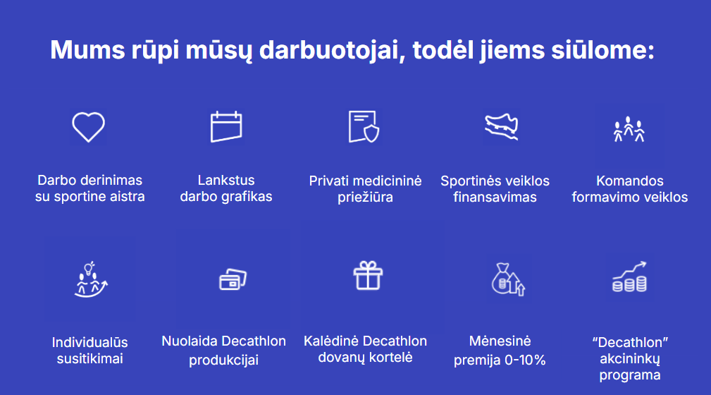 Decathlon įmonėje mes orientuojamės į tokius žmones kaip tu, kuriems sportas yra neatsiejama gyvenimo dalis. Ar nori tobulėti? Pas mus viskas priklauso nuo tavęs. Mūsų sporto entuziastai dažniausiai pradeda savo nuotykius Decathlon kaip klientų aptarnavimo darbuotojai, pardavėjo asistentai arba komandos vadovai. Kas toliau? Galimybės neribotos!